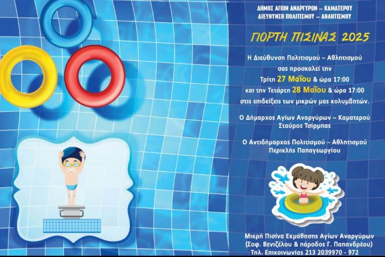Την Τρίτη 27 Μαΐου και την Τετάρτη 28 Μαΐου 2025 θα πραγματοποιηθεί η γιορτή της πισίνας στις 17.