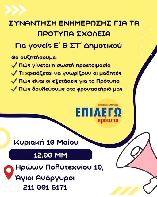 Προσκαλούμε τους γονείς μαθητών Ε΄ και ΣΤ΄ Δημοτικού σε μια ενημερωτική συνάντηση όπου θα συζητήσουμε:
