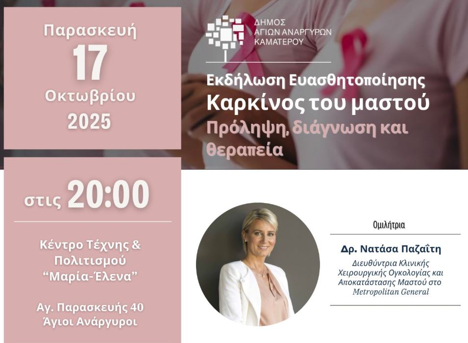 Την Παρασκευή 17 Οκτωβρίου και ώρα 20.00 θα πραγματοποιηθεί εκδήλωση ευαισθητοποίησης για τον καρκίνο του μαστού, που θα πραγματοποιηθεί στο Κέντρο Τέχνης και Πολιτισμού «Μαρία - Έλενα». Κεντρική ομιλήτρια θα είναι η κ. Νατάσα Παζαΐτη, Διευθύντρια Κλινικής Χειρουργικής Ογκολογίας και Αποκατάστασης Μαστού στο Metropolitan Hospital.
