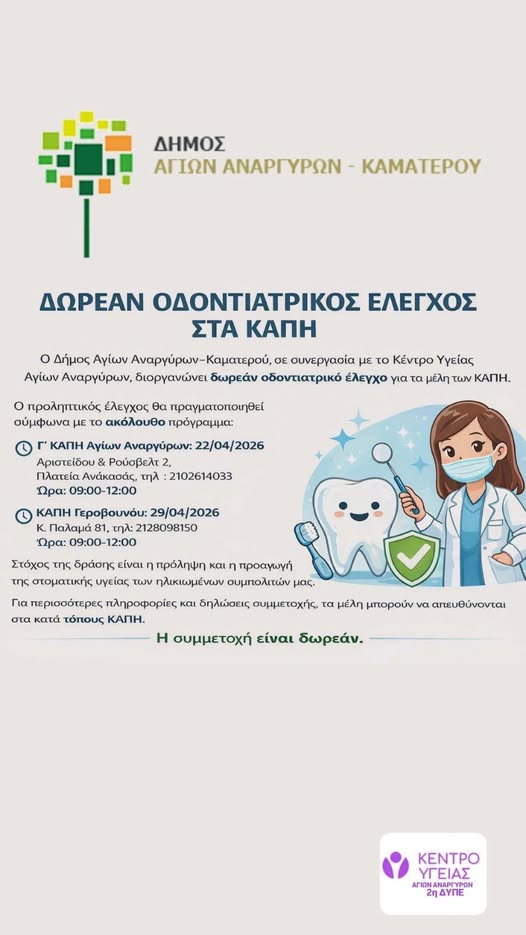 Ο Δήμος Αγίων Αναργύρων-Καματερού σε συνεργασία με το Κέντρο Υγείας Αγίων Αναργύρων, πραγματοποιεί ΔΩΡΕΑΝ Οδοντιατρικό Έλεγχο στα μέλη των ΚΑΠΗ.